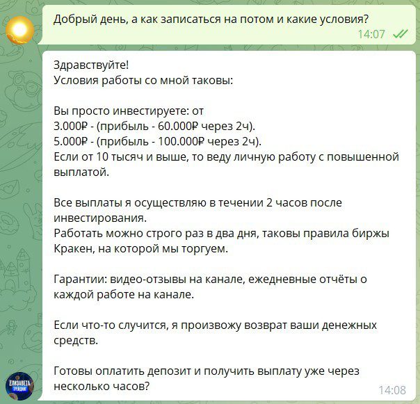 Основная услуга, которая реализуется в Телеграм-канале Елизавета Трейдинг — раскрутка счета. Аналитик предлагает всем желающим записаться к ней на поток и гарантированно увеличить свой капитал в несколько раз.