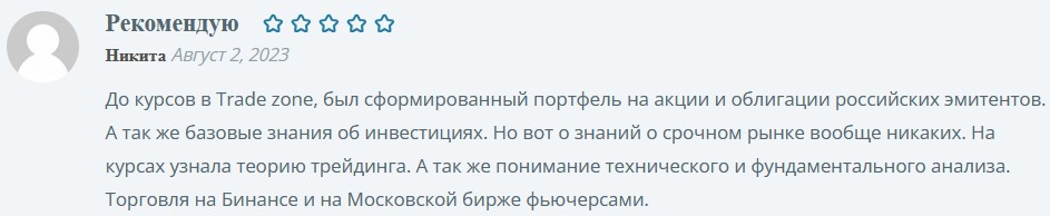 В интернете немало отзывов о трейдере из Ютуба Артеме Назарове и его платформе Трейд Зон, чаще они отрицательные. Ученики утверждают, что качество материалов низкое, а информация просто взята из публичных источников.