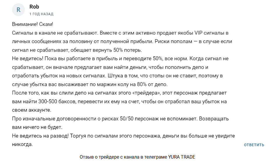 Yuratrade 0 предлагает платную подписку в закрытую группу, где якобы происходит обучение и работа по его системе. Все подробности – в личной переписке. Известно, что он забирает 50% прибыли, если сделки успешные, и обещает частично компенсировать убытки.