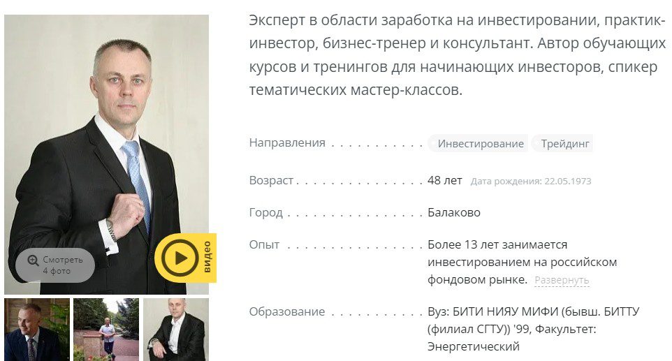 Как рассказывает спекулянт, его профильным образованием является энергетика. Свою деятельность на фондовой бирже он начал 13 лет назад. За довольно солидный период работы он набрался опыта, которым делится со своими учениками.
