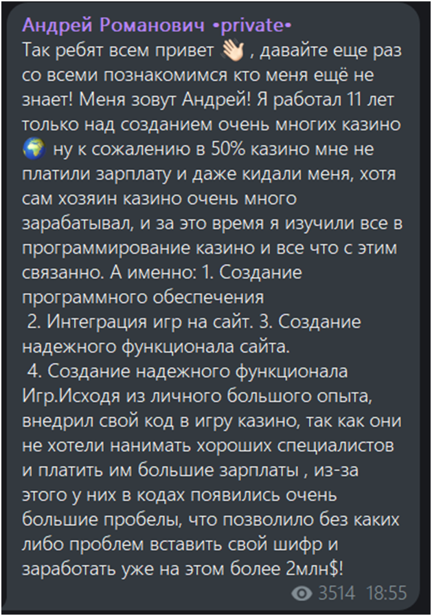 Пользователь под ником AndrewRomann в Телеграмм предлагает пользователям вместе с ним зарабатывать в онлайн-казино. В тг-канале Андрей Романович размещает разные методы получения прибыли, в основном детально рассказывая, что и как нужно разыгрывать. В приветственной публикации он назвал свое имя и сообщил, что работает в сфере более 10 лет, что должно вызывать к нему доверие. Лояльность аудитории вызвана и тем, что специалист упомянул, что несколько лет занимался разработкой ПО для казино-игр и из интеграцией на сайты.