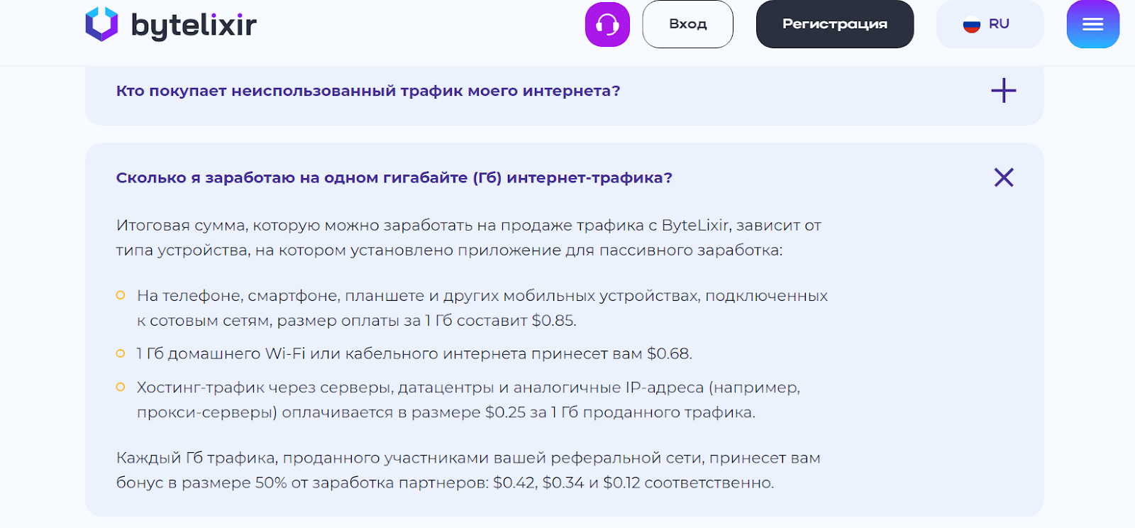 Bytelixir — это проект, предлагающий заработок на продаже интернет-трафика с помощью подключения серверов. По предоставленной информации, цена 1 ГБ оценивается в 0,25-0,85 долларов. Помимо этого, пользователи могут получать доход за партнерскую систему, и основатели обещают безопасное сотрудничество. Далее мы расскажем об особенностях платформы и ее репутации.