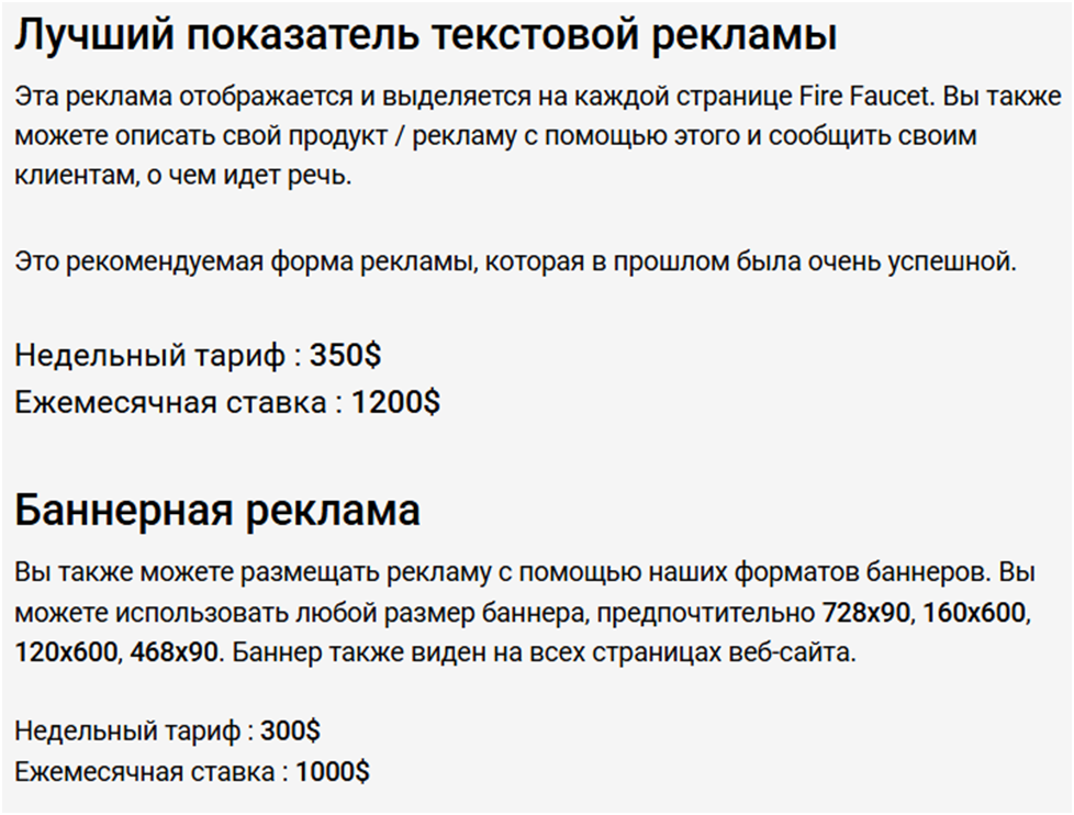 Платформа торгует рекламой, предлагая тестовый и баннерный форматы за 350 и 300 долларов в неделю соответственно. Уточнить детали, согласно отзывам, можно у Partnership FireFaucet Win.