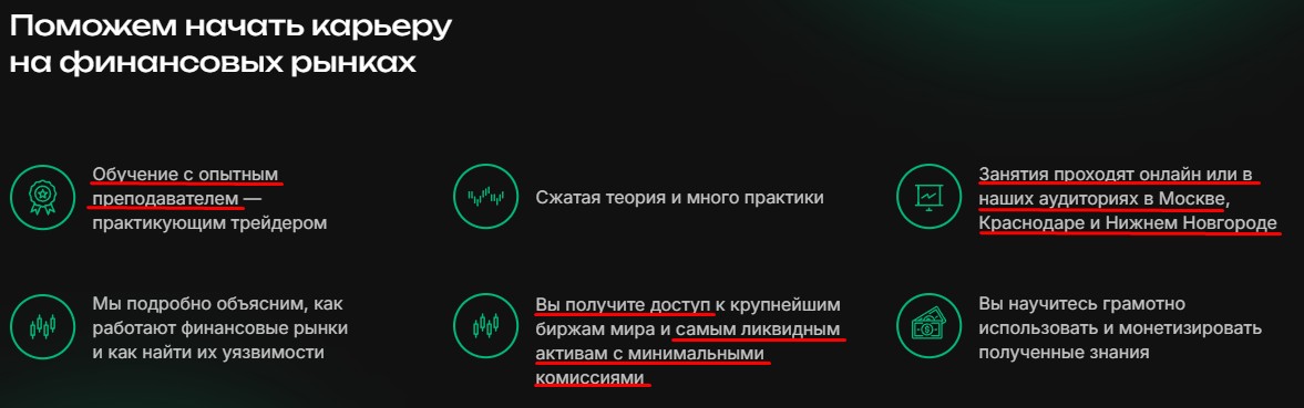 На платформе с курсом клиентам предлагают начать карьеру криптотрейдера. Обучение проходит в режиме онлайн и офлайн в офисе, например, в Москве и Краснодаре. Однако кураторы обещают трейдинг с низкими комиссиями без точных сведений и статистики по прибыли.