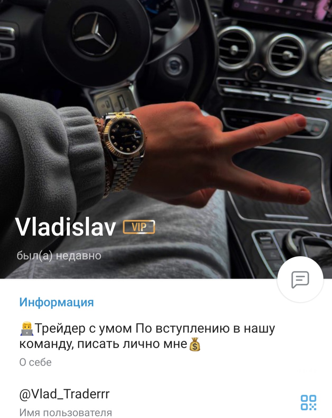 Где и у кого он обучался, не сообщает. Сколько в месяц зарабатывает, скрывает. Информации, подтверждающей его экспертность, нет. У трейдера есть страница в Телеграмм. Она зарегистрирована под ником vlad traderr.