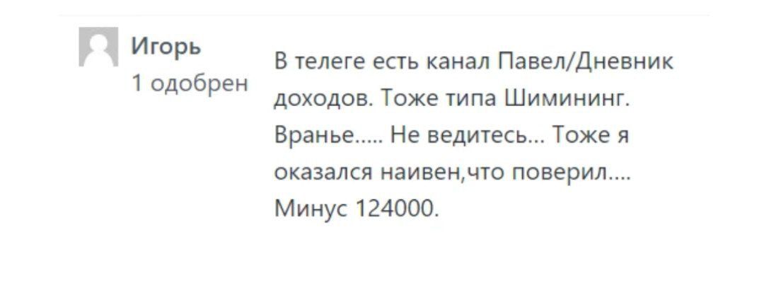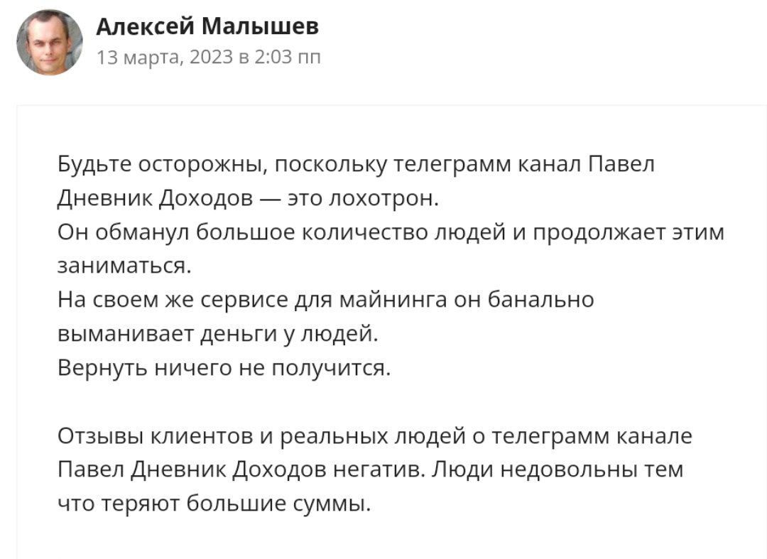 Проходите мимо подобных проектов, ведь рискуете остаться без своих средств. Поделитесь мнением в комментариях о деятельности Телеграм канала Павел | Дневник Доходов. А если у вас были истории, связаны с Павлом (@pavellomm), то расскажите о них ниже.