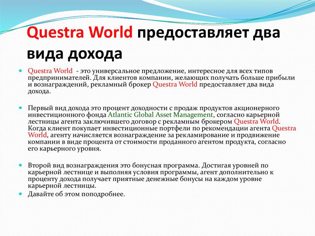 Questra World на официальном сайте предлагает несколько видов заработка. Первый – это получение некоторого процента дохода от продаж Questra World. Схема кажется довольно простой. Так, Atlantic Global Asset Management заключил договор с брокером Questra World. Если клиент приобретает портфели по рекомендации брокера, то ему начисляется некоторый процент.